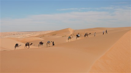 Ahmed et sa caravane chamelière nous fait découvrir les multiples facettes de son pays. La bibliothèque de Chinguetti abrite des manuscrits vieux de plusieurs siècles. C’est le trésor de la mémoire humaine. Nos empreintes sur le sable s’accordent au pas des chameaux. La simplicité du voyage ouvre notre regard sur la beauté des dunes. Les couleurs verdoyantes des palmeraies sont toujours une surprise au cœur du désert. C’est là que nous rencontrons de jeunes écoliers. A Nouakchott, le marché aux poissons est un lieu unique sur la côte atlantique. Des milliers de bateaux viennent affronter les vagues et reviennent avec leur cargaison. Acheteurs et vendeurs négocient dans une ambiance animée.